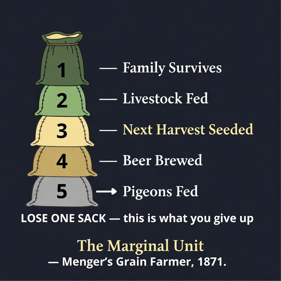The classical economists would say: calculate the labour that went into producing it. Menger says that’s the wrong question entirely. The value of one sack to this farmer is whatever the least important use he’d have to give up if he lost one. Not the most important — the least. Because if he loses a sack, he doesn’t give up feeding his family. He gives up feeding the pigeons.