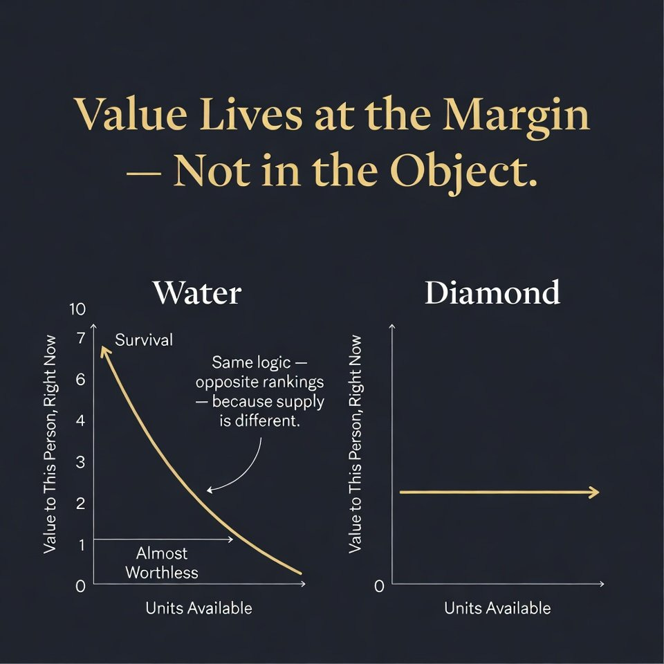 This is why water is cheap and diamonds are expensive under normal conditions. We have so much water that the marginal unit — the next glass — barely matters. We have so few diamonds that each additional one is still precious.